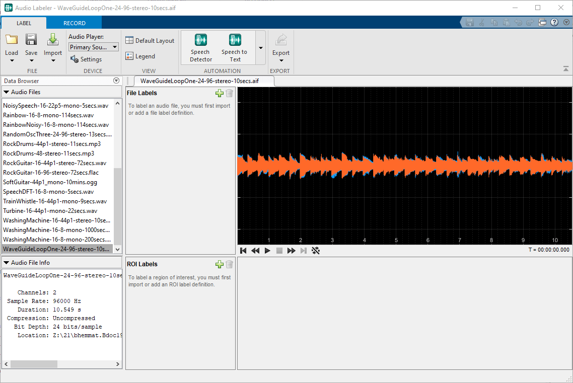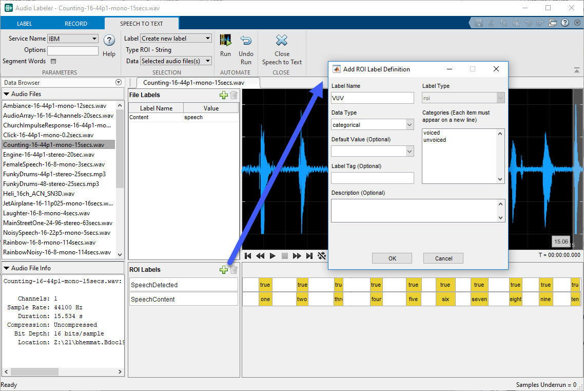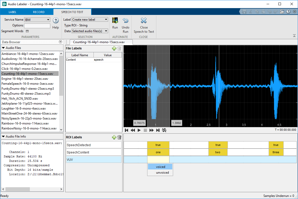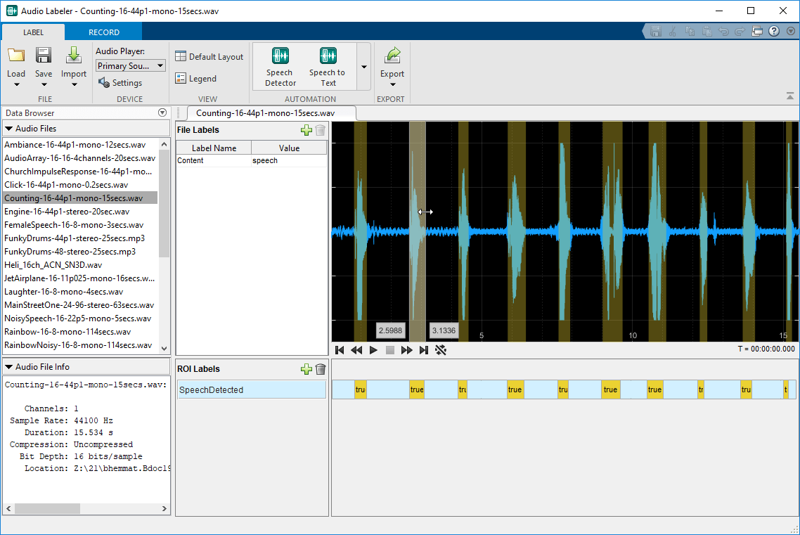 Можно определить метки на уровне региона вручную или с помощью предоставленных автоматизированных алгоритмов. Audio Toolbox включает в себя алгоритмы автоматической маркировки для обнаружения речи и транскрипции речи в текст.