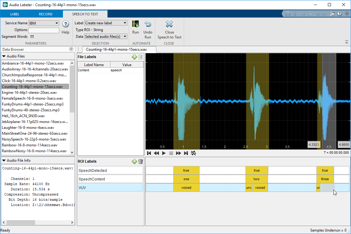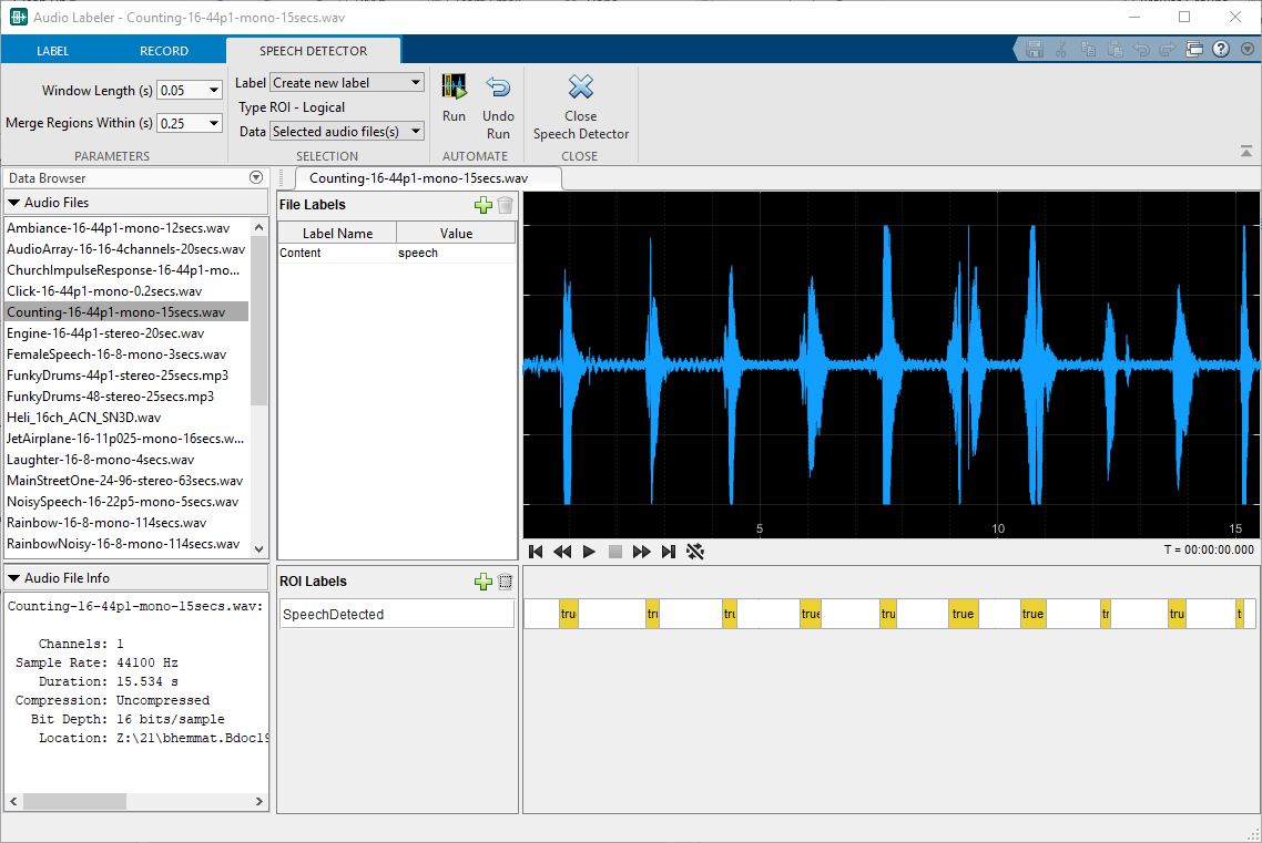 C:\Program Files\MATLAB\R2019b\toolbox\audio\samples\Counting-16-44p1-mono-15secs.wav speech {10×2 table} {10×2 table} {5×2 table}