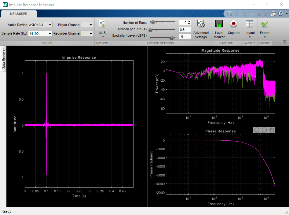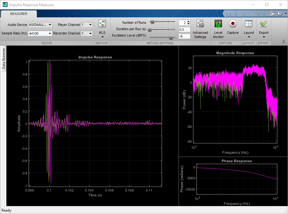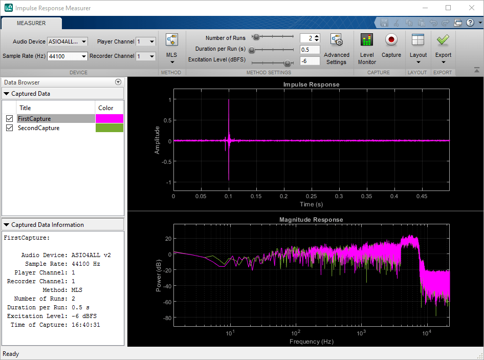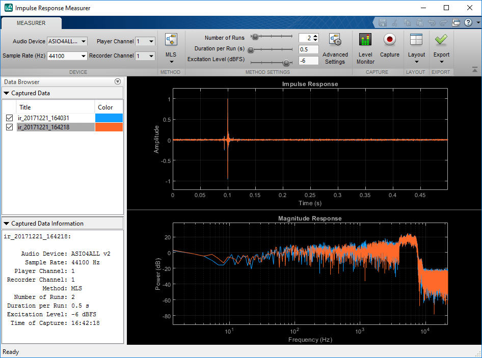 SecondCapture 21-Dec-2017 16:42:18 -0500 [1x1 struct] [1x1 struct] [1x1 struct] "ASIO4ALL v2" 44100 1 1 "MLS" 2 0.5 -6 [1x1 struct] [1x1 struct]При экспорте данных в MAT-файл сохраняется та же таблица, что и при экспорте в рабочую область. При выборе экспорта данных в виде WAV-файла каждый импульсный отклик сохраняется в виде отдельного WAV-файла. Название захвата в качестве имени WAV-файла. В этом примере при выборе экспорта данных в аудиофайл WAV два файла WAV помещаются в указанную папку. FirstCapture.wav и SecondCapture.wav.