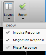 По умолчанию строятся импульсная и магнитудная характеристики. Можно просмотреть любую комбинацию импульсной характеристики, величины и фазовой характеристики с помощью кнопки Компоновка (Layout). Сверните браузер данных, а затем выберите график фазового отклика для включения.