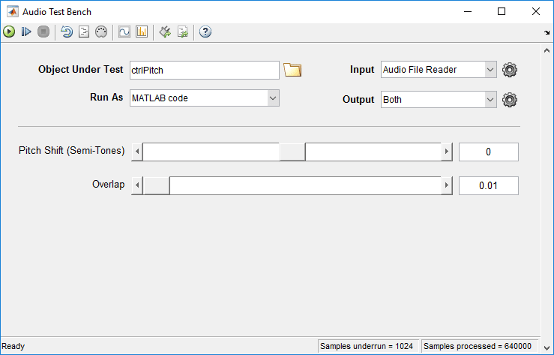 fileReader = dsp.AudioFileReader(... 'Filename','Counting-16-44p1-mono-15secs.wav'); deviceWriter = audioDeviceWriter; % Audio stream loop while ~isDone(fileReader) input = fileReader(); output = ctrlPitch(input); deviceWriter(output); drawnow limitrate; % Process callback immediately end release(fileReader); release(deviceWriter);
