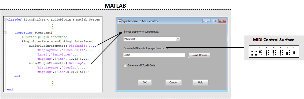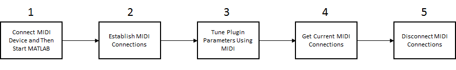 Продукт Audio Toolbox™ предоставляет три функции для включения интерфейса между управляющими поверхностями MIDI и аудиоплагинами: