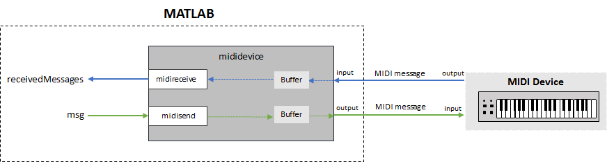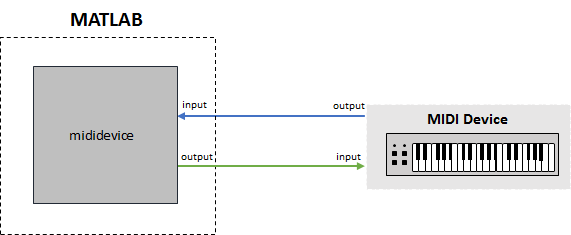 Audio Toolbox позволяет создавать интерфейс с устройством MIDI с помощью mididevice. Чтобы создать интерфейс MIDI для определенного устройства, используйте mididevinfo для запроса доступных устройств в системе. Затем создайте mididevice путем указания MIDI-устройства по имени или идентификатору.