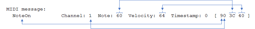 NoteOn Channel: 1 Note: 60 Velocity: 64 Timestamp: 0 [ 90 3C 40 ]Для удобства, midimsg отображает тип сообщения, канал, дополнительные параметры, временную метку и созданное сообщение в шестнадцатеричной форме. Шестнадцатеричная форма является предпочтительной, поскольку имеет простую интерпретацию: