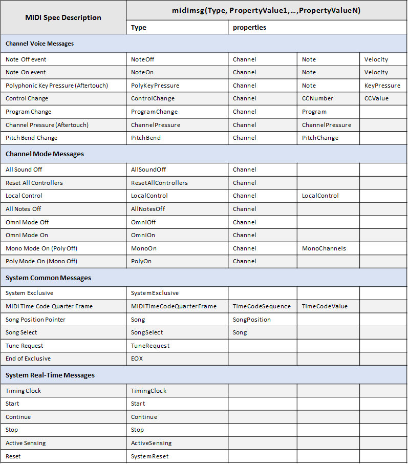 Audio Toolbox предоставляет удобные синтаксисы для создания нескольких сообщений MIDI, используемых последовательно, и для создания массивов сообщений MIDI. Посмотрите midimsg для получения полного списка синтаксисов.
