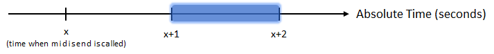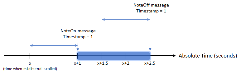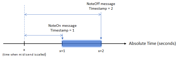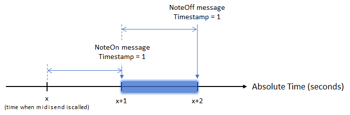 «Начальное» время, или опорное время, для midisend является максимумом между абсолютным временем и наибольшей временной меткой в последнем вызове midisend. Например, предположим, что x, произвольное время начала, равно текущему абсолютному времени. При наличии 1,5-секундной паузы между отправкой сообщений о включении и отключении заметки результирующая длительность заметки составляет 1,5 секунды.