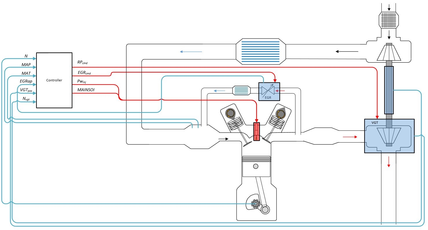 Контроллер управляет процентом площади клапана EGR и положением стойки VGT. Изменение положения стойки VGT изменяет характеристики потока турбины. При низких требуемых крутящих моментах положение стойки может снизить противодавление выхлопа, что приводит к низкой скорости турбокомпрессора и давлению наддува. Когда командуемое топливо требует дополнительного массового расхода воздуха, положение стойки устанавливается таким образом, чтобы закрыть лопатки турбокомпрессора, увеличивая скорость турбокомпрессора и давление наддува впускного коллектора.
