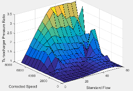 Для расчета соотношения давления турбокомпрессора блок использует две таблицы поиска. Первая справочная таблица определяет приблизительное отношение давления турбокомпрессора как функцию массового расхода турбокомпрессора и скорректированной скорости турбокомпрессора. Используя вторую таблицу поиска, блок корректирует приблизительное отношение давления турбокомпрессора для положения стойки VGT.