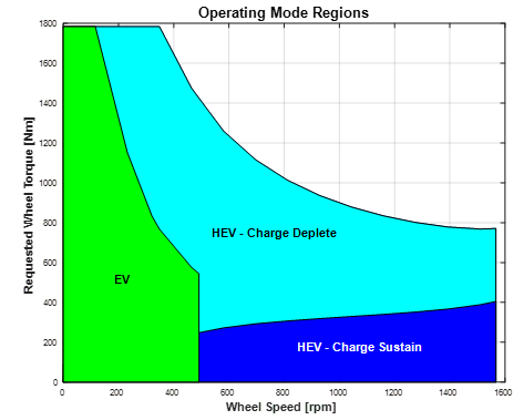 Определяет режим работы транспортного средства с помощью набора правил и логики принятия решений, реализованных в Stateflow. Режимы работы - функции скорости колеса и требуемого крутящего момента колеса. Алгоритм использует запрос мощности колеса, педаль акселератора, SOC аккумулятора и правила скорости транспортного средства для перехода между режимами электромобиля (EV) и HEV.