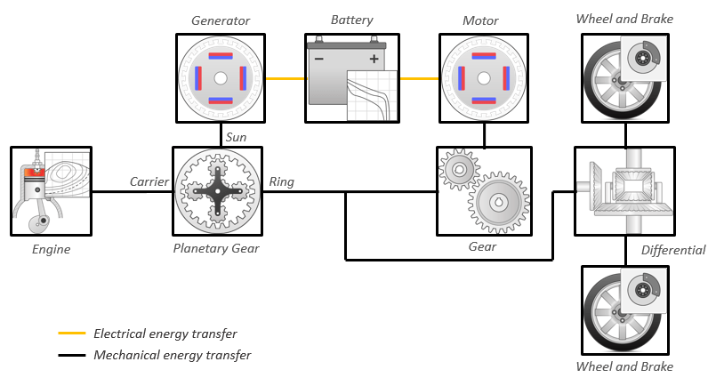 Разделенный на входную мощность HCM реализует динамический управляющий контроллер, который определяет крутящий момент двигателя, крутящий момент генератора, крутящий момент двигателя и команды давления тормоза. В частности, HCM с разделением входной мощности: