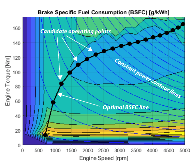 Для вычисления оптимальной рабочей точки двигателя по частоте вращения и крутящему моменту контроллер начинает с возможного набора дискретных уровней мощности двигателя. Для каждого кандидата уровня мощности блок имеет параметризованный вектор рабочих точек крутящего момента и скорости, которые минимизируют BSFC.