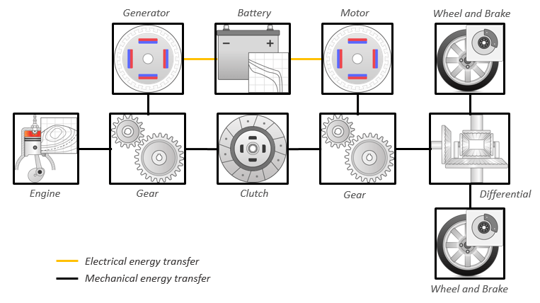 По умолчанию многорежимное эталонное приложение HEV конфигурируется следующим образом:Отображенный двигатель и генератор