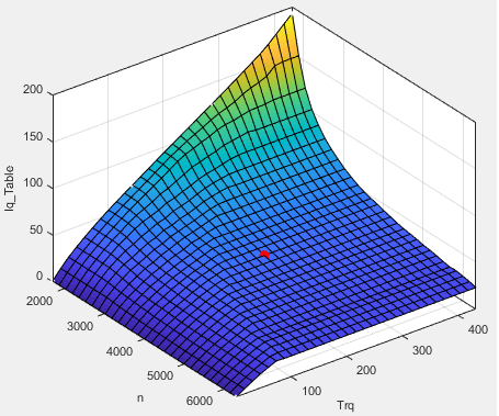 ток по оси q, Iq, как функция крутящего момента двигателя, Trqи скорость двигателя, n.