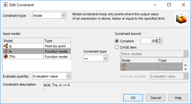 Добавьте ограничение оптимизации для текущей величины, Is. В браузере CAGE выберите «Оптимизация» > «Зависимости» > «Добавить зависимости», чтобы открыть окно «Редактировать зависимость». Используйте диалоговое окно для создания зависимости для текущего.