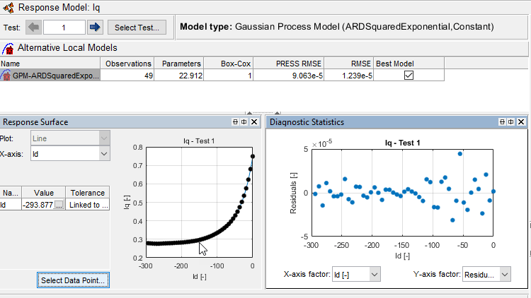 В браузере модели выберите Iq. Изучите поверхность ответа и диагностическую статистику. Эти результаты указывают на достаточно точную подгонку. Можно выполнить обзор каждого теста для проверки реакции на каждую рабочую точку крутящего момента и частоты вращения.