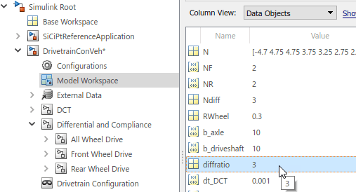В обозревателе моделей для DrivetrainConVeh модель, задайте рабочее пространство модели diffratio параметр для 2.5.