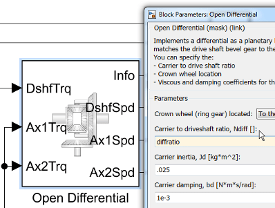 В Passenger Car , перейдите к DrivetrainConVeh > Differential and Compliance > Front Wheel Drive подсистема. Откройте разомкнутый дифференциальный блок.
