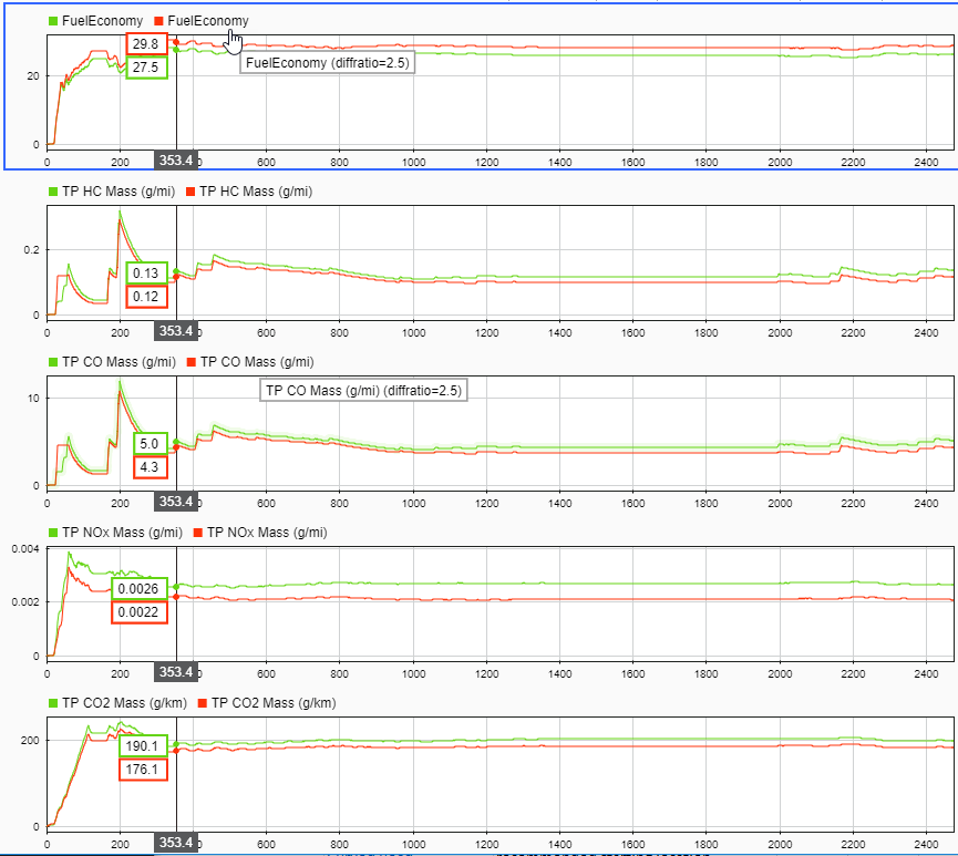 Используйте инспектор данных моделирования для просмотра результатов. Для оценки влияния конечного передаточного числа привода на экономию топлива и выбросы выхлопных газов просмотрите графики результатов моделирования. Например, эти результаты моделирования указывают на лучшее соответствие силового агрегата, когда конечное передаточное число привода равно 2.5: