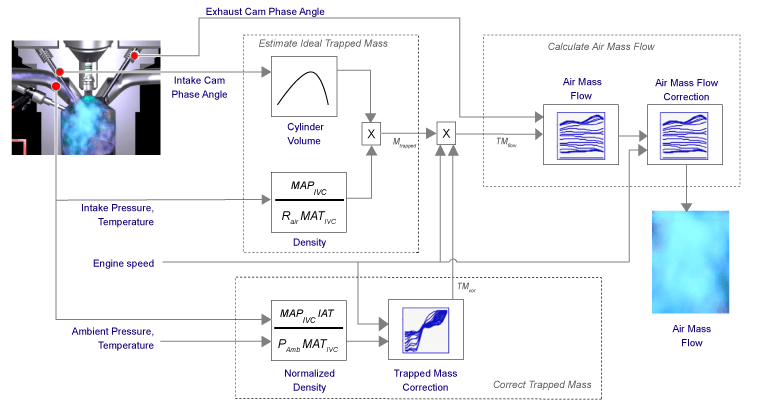 Модель измерения массы всасываемого воздуха с двойным независимым кулачковым фазером использует поправочный коэффициент для учета разницы между идеальной захваченной массой в цилиндре и фактической захваченной массой. Коэффициент коррекции захваченной массы представляет собой таблицу поиска, которая является функцией нормированной плотности и частоты вращения двигателя.