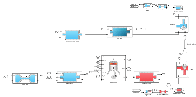 SiEngineCore.slx содержит подсистему впуска двигателя, выхлопную систему, основной двигатель и подсистему турбокомпрессора.