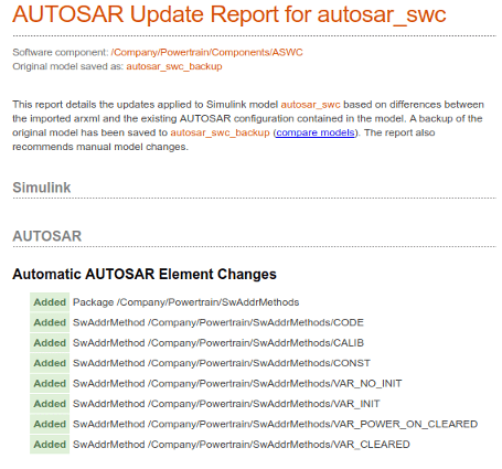 updateAUTOSARProperties( обновляет указанную открытую модель элементами AUTOSAR в XML-файлах, связанных с ar,modelname)arxml.importer объект ar. В результате обновления создается отчет с подробным описанием элементов AUTOSAR, добавленных в модель. Для updateAUTOSARProperties, связанные XML-файлы определений не должны содержать программный компонент AUTOSAR, сопоставленный с моделью. (Сравните с updateModel, для чего требуется компонент.)