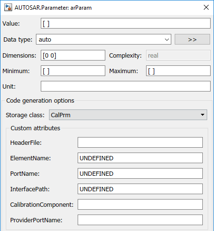 Simulink.Parameter подробно описывает атрибуты параметра. AUTOSAR.Parameter класс расширяет Simulink.Parameter со следующими дополнительными параметрами выбора для атрибута класса Storage: