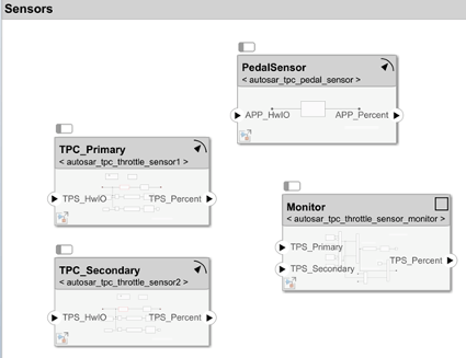 Обычно композиция AUTOSAR содержит набор компонентов и композиций AUTOSAR с общей целью. В рамках создания приложения для управления положением дроссельной заслонки в данном учебном пособии четыре компонента датчиков помещаются в состав датчиков.