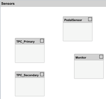 Откройте блок «Сенсоры», чтобы на холсте модели отображалось содержимое композиции. Добавьте в композицию программные компоненты AUTOSAR с именами TPS_Primary, TPS_Secondary, Monitor и PedalSensor. Например, на вкладке Моделирование (Modeling) можно выбрать Компонент программного обеспечения (Software Component) для создания каждого компонента.