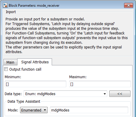 Примените тип данных перечисления к входному порту Simulink, который представляет порт-приемник режима AUTOSAR. В этом диалоговом окне «Блок ввода» перечисляемый тип mdgModes указывается как тип данных для ввода.