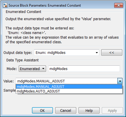 Объявите группу объявления режима - группу значений режима - с помощью перечисления Simulink. Например, можно создать перечисляемый тип mdgModes, с перечисленными значениями MANUAL_ADJUST и AUTO_ADJUST. Укажите тип склада как целое число без знака.