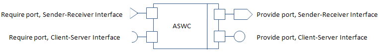На следующем рисунке показан программный компонент AUTOSAR с четырьмя портами, представляющими комбинации портов и интерфейсов для интерфейсов отправитель-получатель и клиент-сервер.