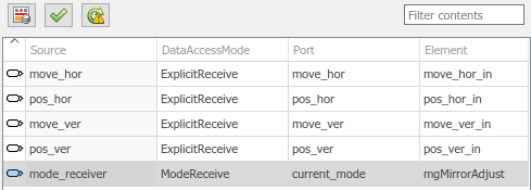 В следующем примере на вкладке «Inports» редактора «Code Mappings» выберите «Simulink inport». mode_receiver сопоставляется с портом-приемником режима AUTOSAR current_mode и элемент AUTOSAR mgMirrorAdjust.