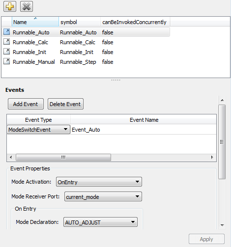 В представлении Runnables словаря AUTOSAR выберите запускаемую возможность активации события переключения режимов. Настройте событие. В следующем примере добавляется событие переключения режимов для Runnable_Autoи сконфигурирован для активации при входе (по сравнению с выходом или переходом). Он сопоставляется с ранее сконфигурированным портом-приемником режима и значением объявления режима, которое является действительным для выбранного порта.