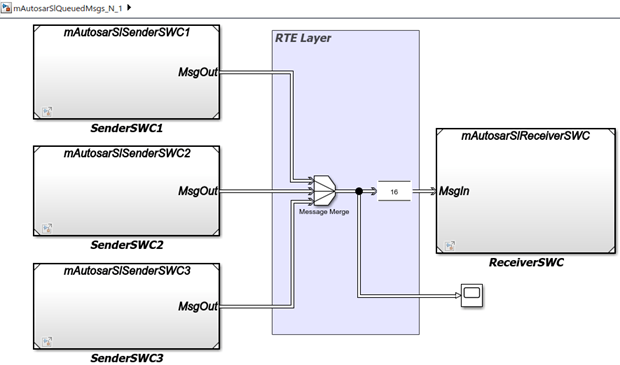 Можно смоделировать связь отправителя-получателя (S-R) в очереди AUTOSAR между моделями компонентов, например, при моделировании на уровне композиции. Отправители и получатели данных могут работать с разными скоростями. Несколько отправителей данных могут взаимодействовать с одним приемником данных.