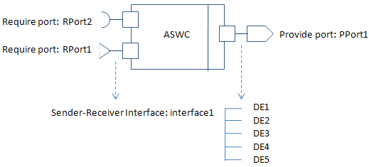 Программный компонент AUTOSAR имеет Require и Provide порт, который ссылается на тот же интерфейс отправителя-получателя, Interface1. Хотя этот интерфейс содержит элементы данных DE1, DE2, DE3, DE4, и DE5, компонент не использует все элементы данных.