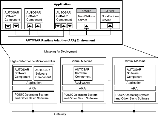 Адаптивная платформа поддерживает независимую от оборудования разработку и использование прикладного программного обеспечения AUTOSAR. Абстрактные представления RTE для определенных ECU (микроконтроллеры, высокопроизводительные микроконтроллеры и виртуальные машины) отделяют программные компоненты AUTOSAR на прикладном уровне архитектуры от инфраструктуры архитектуры. Компоненты программного обеспечения AUTOSAR и базовое программное обеспечение и услуги взаимодействуют с помощью выделенных портов. Настройка приложения выполняется путем сопоставления портов компонентов с представлениями RTE системных ЭБУ.