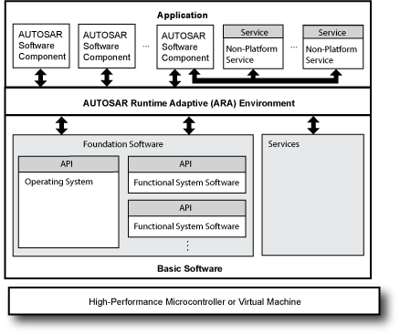Уровень RTE архитектуры программного обеспечения включает в себя стандартную библиотеку C++. Он поддерживает связь между компонентами программного обеспечения AUTOSAR на уровне приложений и между компонентами программного обеспечения AUTOSAR и программным обеспечением, предоставляемым уровнем базового программного обеспечения. Уровень базового программного обеспечения состоит из программного обеспечения и услуг системного фундамента. Компоненты программного обеспечения AUTOSAR на уровне приложений взаимодействуют друг с другом, с помощью неплатформенных служб, а также с базовым программным обеспечением и службами, реагируя на сообщения, управляемые событиями. Программные компоненты взаимодействуют с программным обеспечением уровня базового программного обеспечения с помощью интерфейсов прикладного программирования (API) C++.
