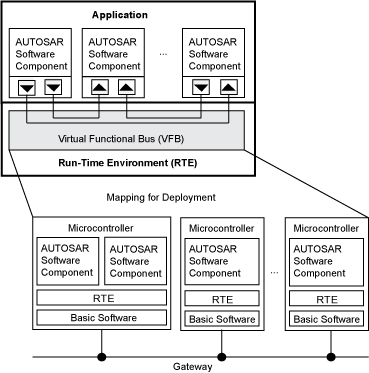 Классическая платформа использует виртуальную функциональную шину (VFB) для поддержки аппаратно-независимой разработки и использования прикладного программного обеспечения AUTOSAR. Шина состоит из абстрактных представлений RTE для конкретных ECU, отделяющих программные компоненты AUTOSAR на прикладном уровне архитектуры от архитектурной инфраструктуры. Программные компоненты AUTOSAR и шина взаимодействуют с помощью выделенных портов. Настройка приложения выполняется путем сопоставления портов компонентов с представлениями RTE системных ЭБУ.