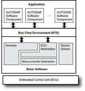 Уровень Run-Time Environment (RTE) архитектуры программного обеспечения управляет связью между компонентами программного обеспечения AUTOSAR на уровне приложений и между компонентами программного обеспечения AUTOSAR и услугами, предоставляемыми уровнем базового программного обеспечения. Уровень базового программного обеспечения состоит из:
