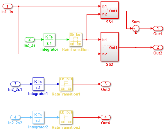 Вот пример многозадачной модели на основе скорости, которая подходит для моделирования и генерации кода AUTOSAR. (В этом примере используется модель .) Модель представляет программный компонент AUTOSAR. Цвета, отображаемые при обновлении модели (если цвета включены на вкладке Отладка (Debug) в разделе Диагностика (Diagnostics) > Информационные наложения (Information Overlays)), представляют различные периодические скорости. Блоки Rate Transition представляют IRV AUTOSAR.matlabroot/help/toolbox/autosar/examples/mMultitasking_4rates.slx