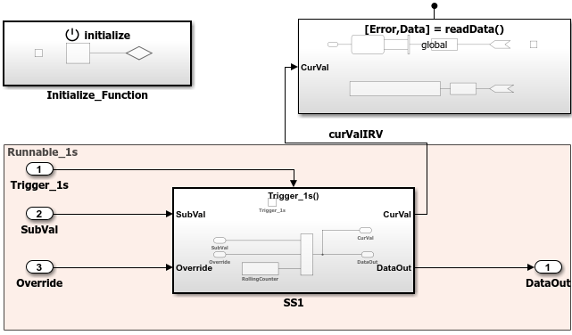 Ниже приведен пример основанной на вызове функции модели с несколькими исполняемыми объектами, которая подходит для моделирования и генерации кода AUTOSAR. (В этом примере используется пример модели AUTOSAR autosar_swc_slfcns.) Модель представляет программный компонент AUTOSAR. Подсистема вызова функций с меткой SS1 и функциональный блок Simulink readData представляют выполняемые объекты, реализующие их поведение. Инициализирующий функциональный блок инициализирует компонент. Сигнальная линия curValIRV представляет собой IRV AUTOSAR.