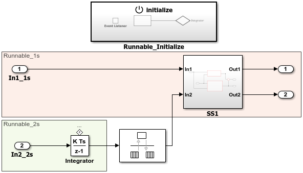 Входы и выходы корневой модели представляют собой порты AUTOSAR, а блоки Rate Transition представляют собой межпроходные переменные (IRV) AUTOSAR.