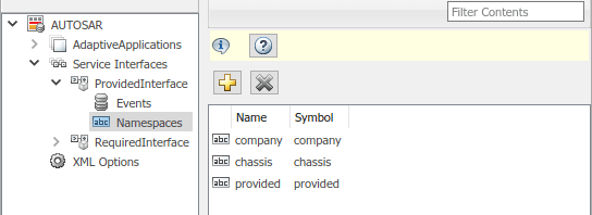 Выберите Пространства имен. Представление пространств имен позволяет определить уникальное пространство имен для каждого сервисного интерфейса. Генератор кода использует определенное пространство имен при создании кода C++ для интерфейса. Чтобы изменить или создать спецификацию пространства имен, выберите элемент пространства имен и измените значение имени. Например, это представление пространств имен определяет пространство имен company::chassis::provided для сервисного интерфейса ProvidedInterface.