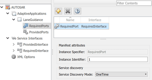 Дополнительно для требуемых портов AUTOSAR можно настроить обнаружение служб, что влияет на то, как адаптивные приложения находят динамические службы. В представлении RequiredPorts выберите порт и настройте его режим обнаружения службы. Выбрать OneTime или DynamicDiscovery. Дополнительные сведения см. в разделе Настройка режимов адаптивного обнаружения служб AUTOSAR.