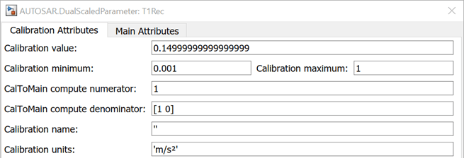% Conversion from Time to Frequency % F = 1/T % In Other Words F = (0*T + 1)/(1*T+0); T1Rec.CompuMethodName = 'CM3'; %Specify AUTOSAR CompuMethod name T1Rec.DataType ='fixdt(1,32,0.01,0)'; T1Rec.CalToMainCompuNumerator=1; T1Rec.CalToMainCompuDenominator=[1 0]; T1Rec.CalibrationMin = 0.001; T1Rec.CalibrationMax = 1.0; T1Rec.CalibrationValue = 0.1500; T1Rec.CoderInfo.StorageClass = 'Custom'; T1Rec.CoderInfo.Identifier = ''; T1Rec.CoderInfo.CustomStorageClass = 'InternalCalPrm'; T1Rec.CoderInfo.CustomAttributes.PerInstanceBehavior =... 'Parameter shared by all instances of the Software Component'; T1Rec.Description = ''; % T1Rec.Min = []; % T1Rec.Max = []; T1Rec.Unit = ''; T1Rec.CalibrationDocUnits = 'm/s²';