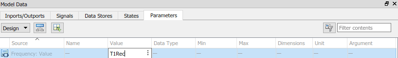Откройте Редактор данных модели (Model Data Editor) (на вкладке Моделирование (Modeling) щелкните Редактор данных модели (Model Data Editor)) и выберите вкладку Параметры (Parameters). Найдите запись параметра для блока константы. Столбец Значение (Value) используется для ссылки на имя параметра с двойным масштабированием. В этом примере используется имя параметра T1Rec.