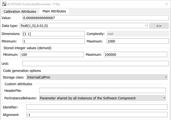 В диалоговом окне «Создание новых данных» задайте для параметра «Значение» значение AUTOSAR.DualScaledParameter и нажмите кнопку «Создать». Один AUTOSAR.DualScaledParameter объект данных появляется в базовой рабочей области. Откроется диалоговое окно свойства параметра с двойным масштабированием.