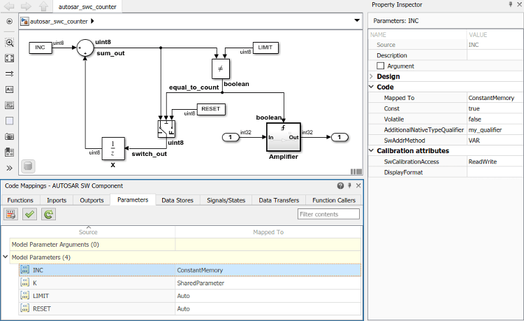 В ракурсе кода AUTOSAR откройте редактор «Сопоставления кодов» и перейдите на вкладку «Параметры». В списке доступных параметров выберите INC. При выборе параметра атрибуты параметров отображаются в Инспекторе свойств. Используйте инспектор свойств для изменения атрибутов параметров. В раскрывающемся списке «Сопоставлено» выберите ConstantMemory. Дополнительные сведения о коде параметра и атрибутах калибровки см. в разделе Сопоставление параметров рабочего пространства модели с параметрами компонента AUTOSAR.