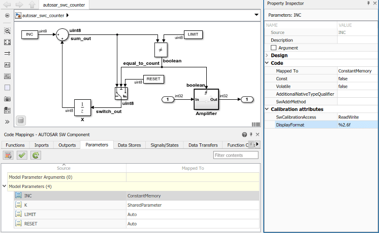 hModel = 'autosar_swc_counter'; addpath(fullfile(matlabroot,'/examples/autosarblockset/main')); open_system(hModel); slMap = autosar.api.getSimulinkMapping(hModel); mapParameter(slMap,'INC','ConstantMemory','DisplayFormat','%2.6f')