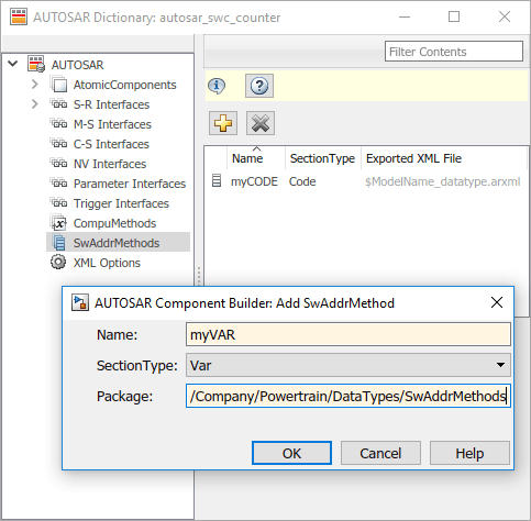 Создать SwAddrMethods в существующей модели откройте режим просмотра AUTOSAR Dictionary, SwAddrMethods и нажмите кнопку Add.